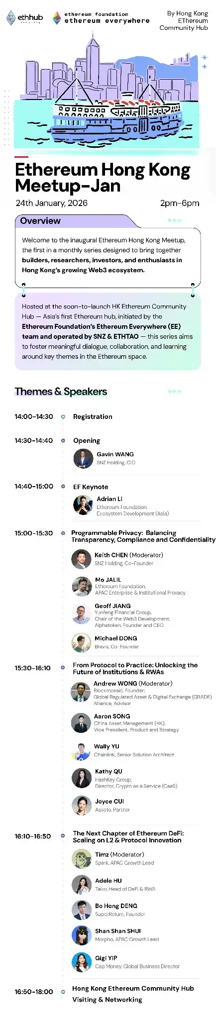 As the first public appearance of the Hong Kong Ethereum Community Hub, this event will feature Adrian Li, Head of Ecosystem Development Asia at the Ethereum Foundation; Mo Jalil, Head of Institutional Privacy Asia-Pacific at the Ethereum Foundation; and representatives from leading global Ethereum projects in key sectors. Focusing on three cutting-edge topics—privacy compliance, institutional asset on-chain, and DeFi and Layer2—the event will include participation from core projects and institutions such as Chainlink, HashKey Group, Yunfeng Financial Group, ChinaAMC, Brevis, Asseto, Spark, Taiko, and Morpho. The aim is to build a high-end professional exchange platform to explore new directions for the future development of the Ethereum ecosystem and unlock the secrets of industry innovation.