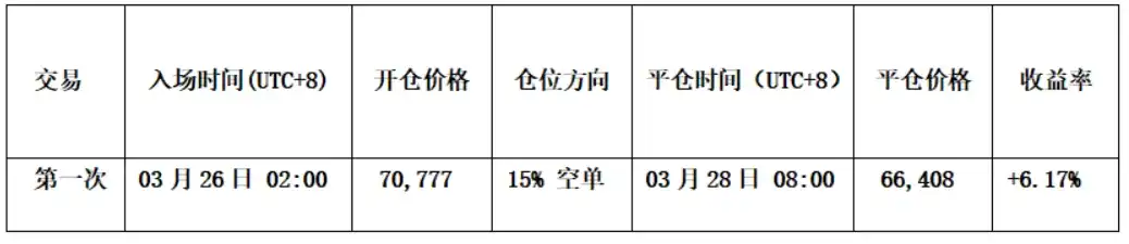 • Entry: When the price rebounded near $72,000 and met resistance, the Spread Trading Model simultaneously triggered a top预警 signal (white dot), forming a short-selling共振 (resonance) with the Momentum Quant Model. Based on this signal叠加 (overlay), we established a 15% short position at $70,777.