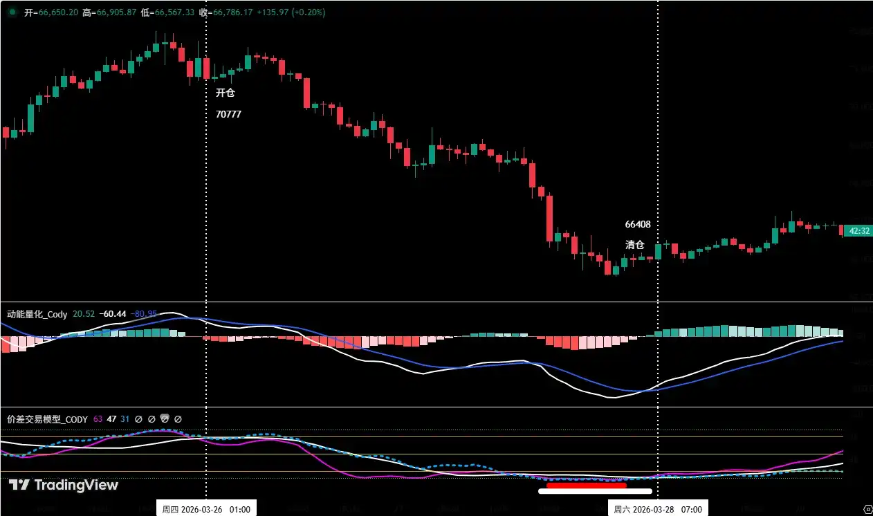 • Exit: When the price fell near $65,000 and stabilized, and the Spread Trading Model triggered a strong bottom预警 signal (red dot + white dot), we therefore closed the entire position near $66,408.