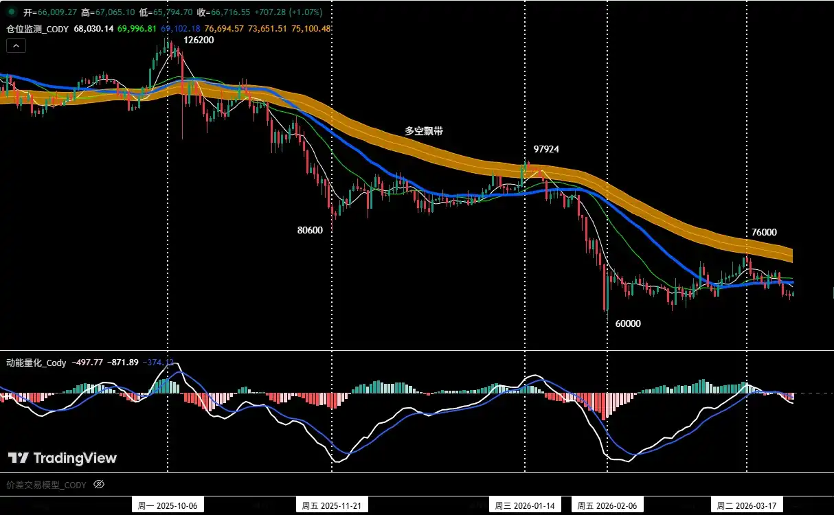 • Entry: When the price effectively breaks below the $65,000~$66,000 area and combines with model top signals, a 30% short position can be established顺势 (following the trend).