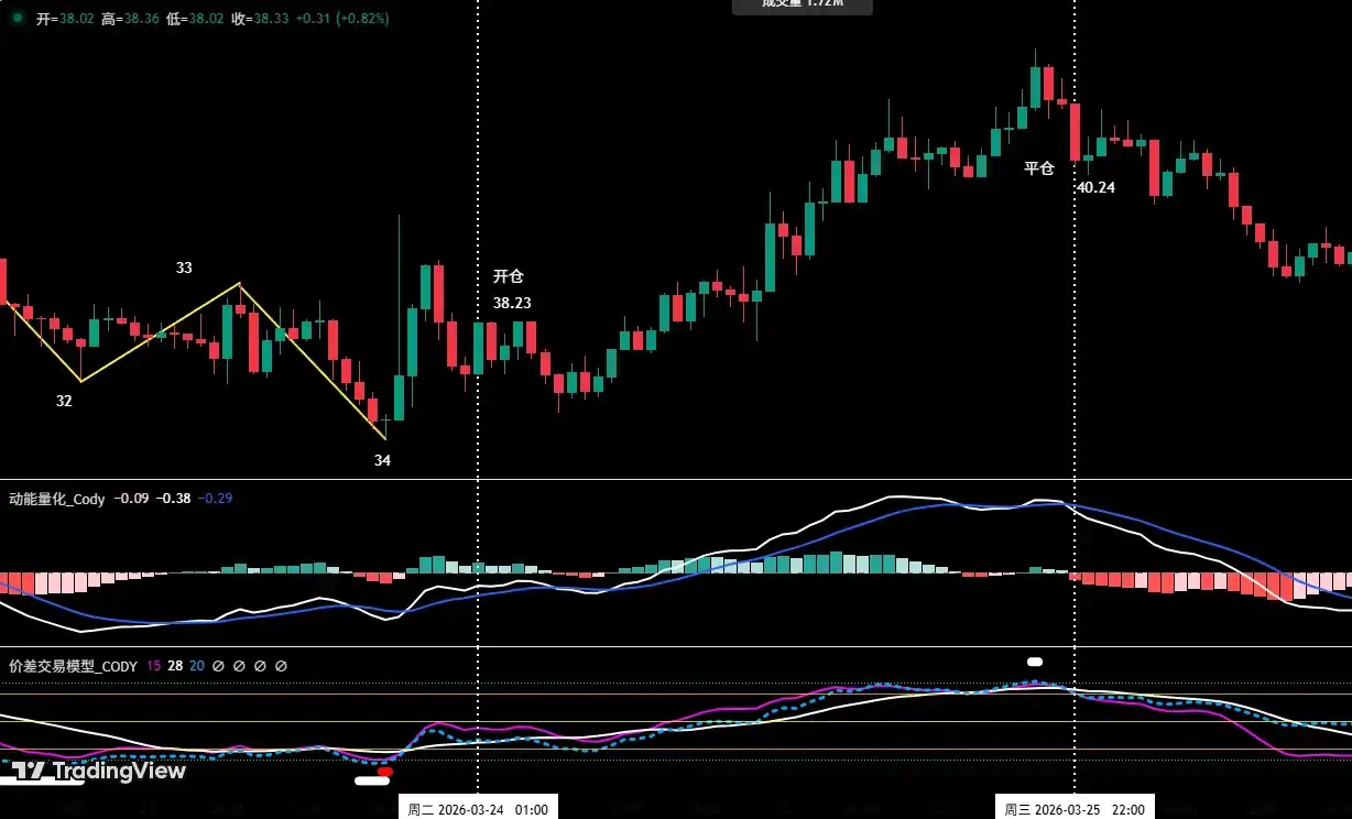 • Exit Decision: Based on the Spread Quant Model triggering a top bearish signal (white dot); the Momentum Model issuing a top divergence signal; and the candlestick combination forming a "strong top分型" signal. These three signals formed a technical共振 (resonance), so we executed a full position close near $40.24.