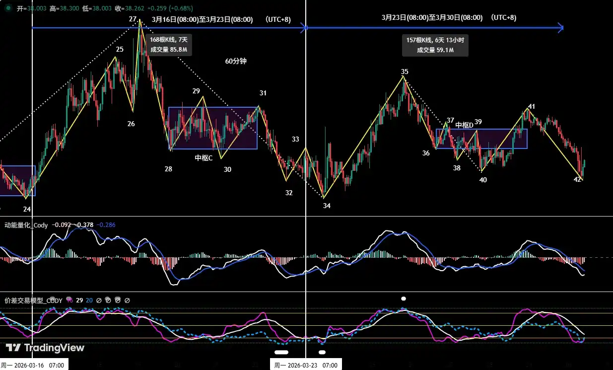 • As shown in (Figure 2), reviewing HYPE's hourly movement from the 16th to the 22nd, the price successfully built a下跌中枢 (declining中枢,中枢 C). We initially predicted the low might form near endpoint 32 (~$37.52), but the actual low appeared at the lower endpoint 34 (~$36.79), about $0.73 lower than predicted.