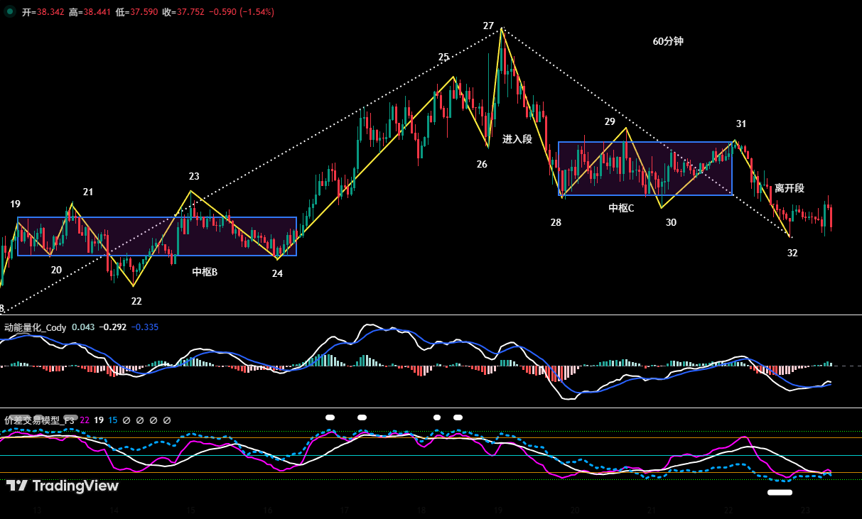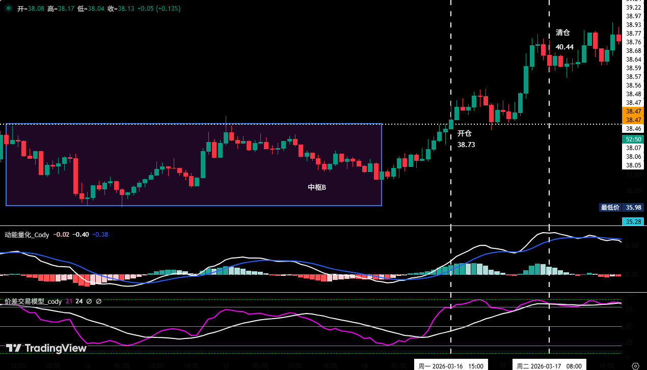 • Opening Decision: This opening decision was based on the prediction of trend continuation after the completion of upward Central Range B. The specific trigger signal was the price effectively breaking through the central range's upper rail resistance (approx. $38.54), and both the spread and momentum quantitative models发出 (issuing) bullish共振 (resonance) signals. The叠加 (superimposition) of multiple bases significantly improved the reliability of the entry timing. Accordingly, we executed a 30% long position at $38.73.