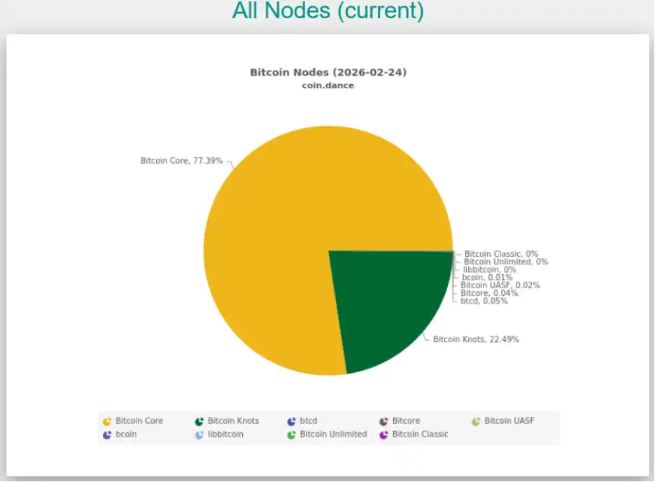 As the controversy fermented, Bitcoin Knots' market share has surged to 22.49%, while the share of the full-node client Bitcoin Core has significantly dropped to 77.39%. This trend indicates that a considerable number of nodes are expressing support for data limits by switching clients.