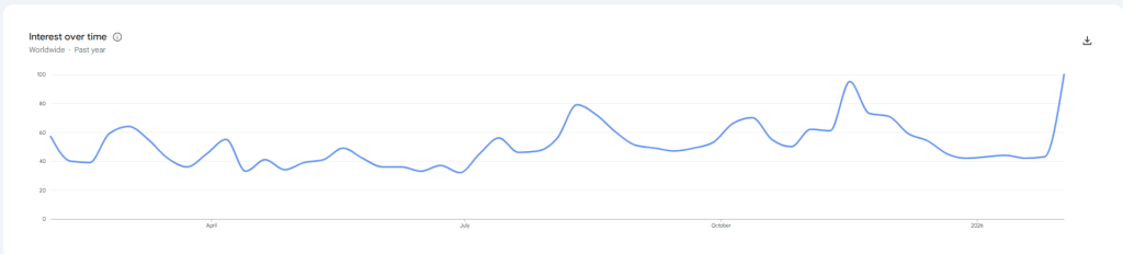 According to Google Trends data analyzed by market outlets, the search index for Bitcoin hit the top score of 100 starting the week of February 1, 2026 — the peak level recorded in the past 12 months.