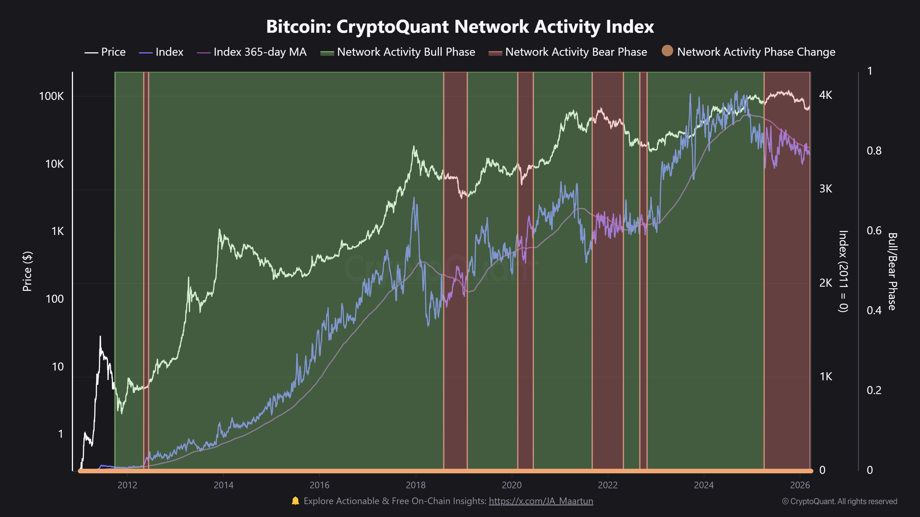 CryptoQuant’s Network Activity Index for Bitcoin has been locked in a downtrend, suggesting that demand for using the blockchain remains weak.