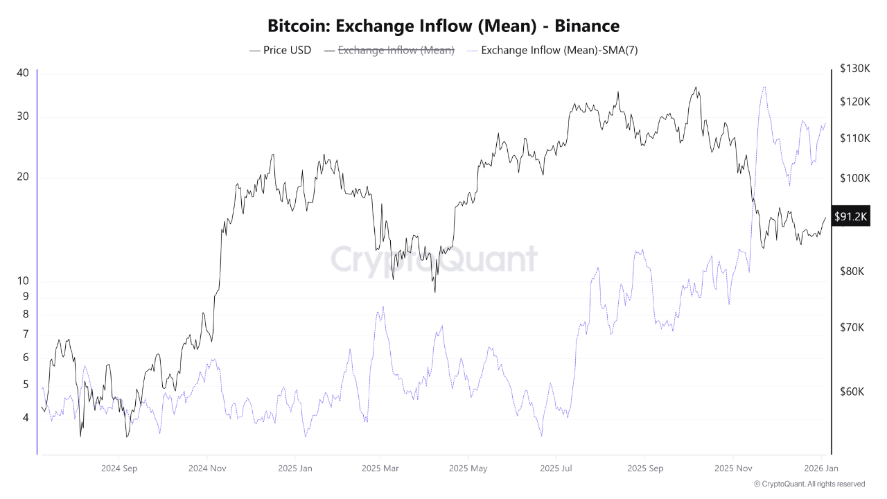 Adding complexity to the outlook, a recent CryptoQuant report by CryptoOnchain highlights a notable divergence in Binance flow data that deserves attention. The analysis compares the average size of Bitcoin deposits and withdrawals on the exchange since October and points to a growing imbalance beneath the surface. On one side, the average inflow size has increased sharply, implying that larger holders are moving more BTC onto exchanges. On the other, average outflows remain subdued, signaling weaker accumulation behavior and limited movement into long-term storage.