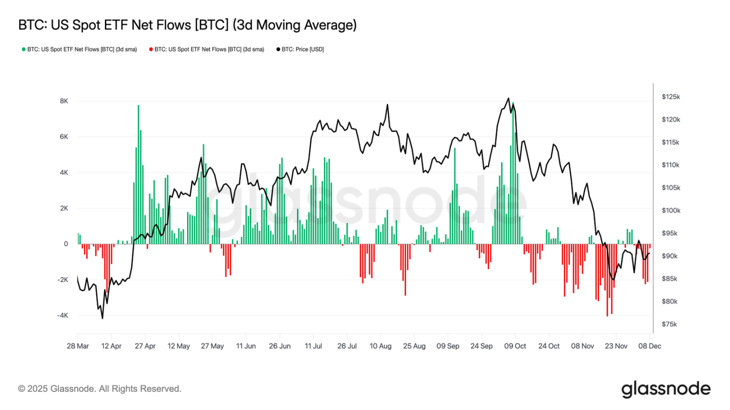 Turning to the spot market, U.S. Bitcoin ETFs had another quiet week, with the three-day average net inflows remaining negative. This continues the cooling trend that began in late November, marking a clear departure from the strong inflow regime that supported price appreciation earlier this year. Redemptions from several major issuers remained steady, highlighting a more risk-off stance from institutional allocators amid a shaky broader market environment.