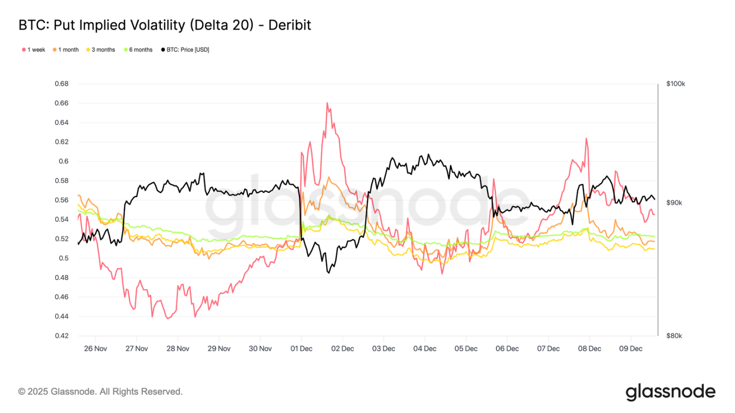 On 20-Delta calls, 1-week IV rose by about 10 volatility points compared to last week, while longer tenors remained relatively flat. The same pattern appears on 20-Delta puts, with short-term downside IV rising while longer tenors stay calm.