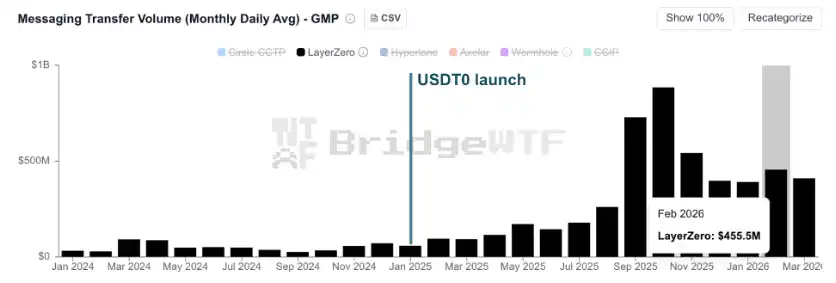 As shown in the figure below, daily settled value accelerated sharply after USDT0's launch, transforming LayerZero from a messaging layer into critical financial infrastructure.