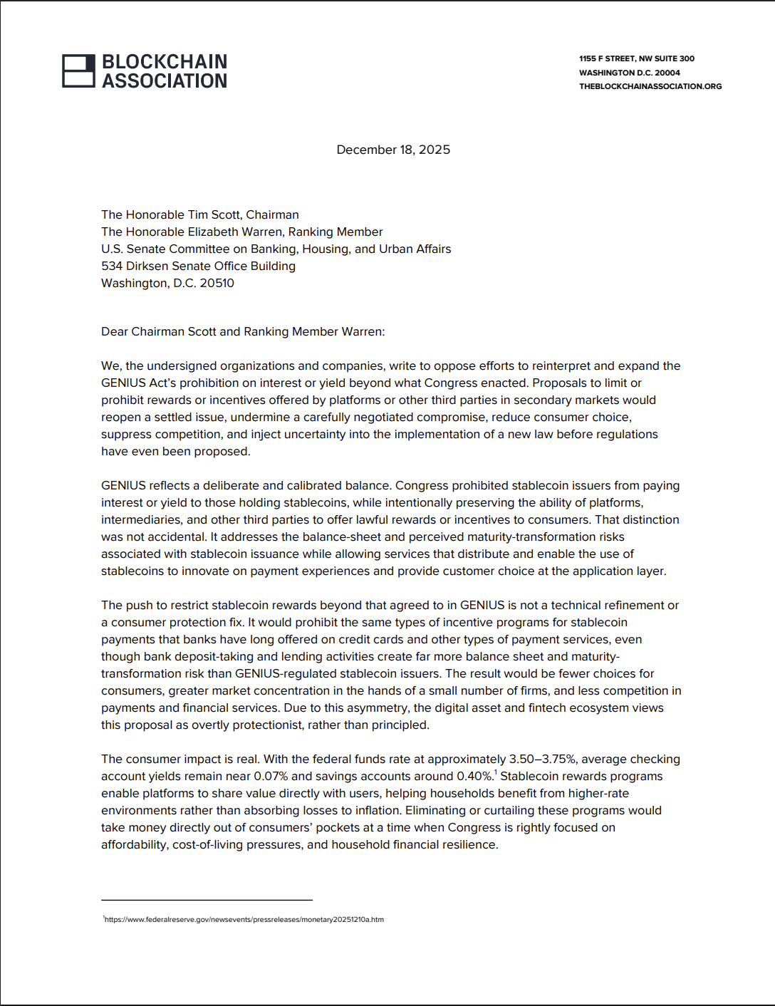 The Blockchain Association, a non-profit crypto advocacy organization, wrote a letter to the US Senate Committee on Banking, signed by over 125 crypto industry groups and companies, opposing the ban on third-party service providers and platforms offering customer rewards to stablecoin holders.