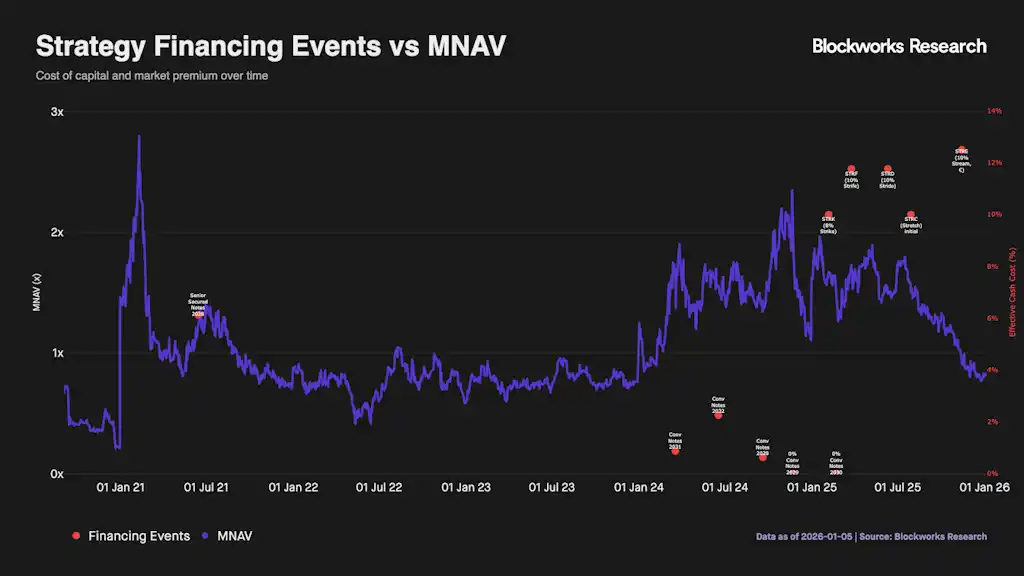 A more critical signal lies in the change in financing structure. From 2024 to early 2025, Strategy financed through low-cost convertible bonds—cash coupons as low as 0.625% to 2.25%, and later issued multiple zero-coupon convertible bonds. This strategy worked best when MSTR traded at a premium to Bitcoin NAV (mNAV > 1), as the equity option value itself was attractive.