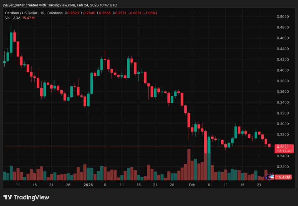 While institutional signals have strengthened, ADA’s market structure remains under pressure. The token is trading around $0.25 after a prolonged downtrend from January highs around $0.42.