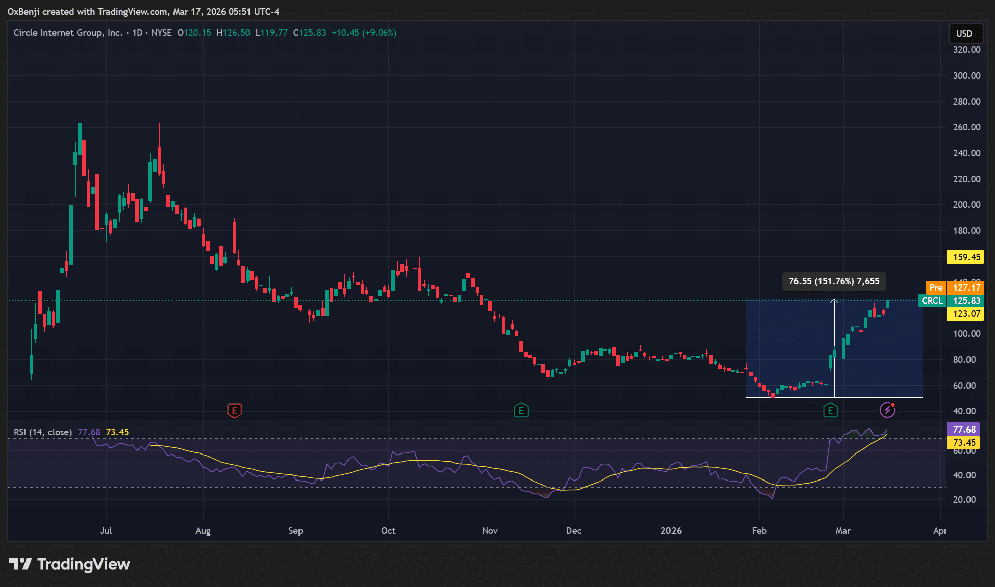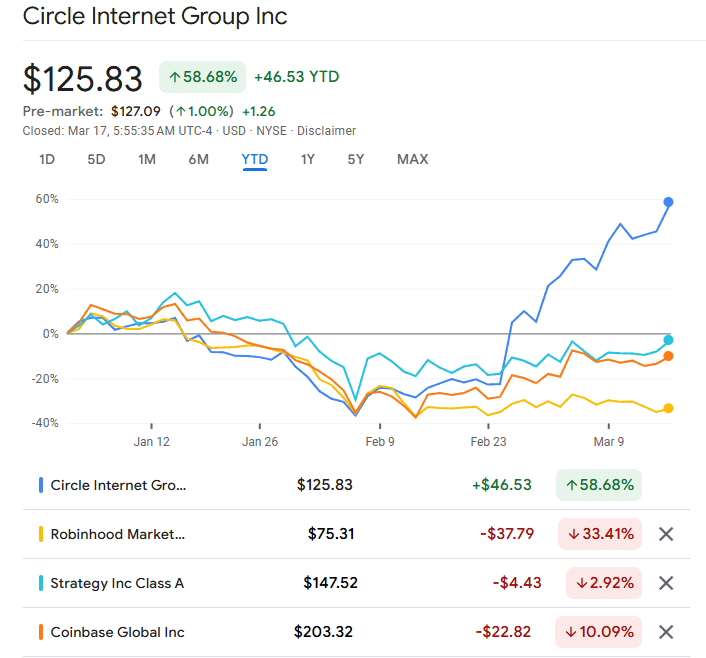 Circle Internet Group stock, CRCL, has recovered by over 150% from its February lows of $49.9 – A 2.5x pump in a month. On the 17th of March alone, the stock added an extra 9%, closing at $125.83.