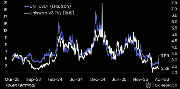 UNI-USDT vs. Uniswap V3 TVL – Weak DeFi Momentum
