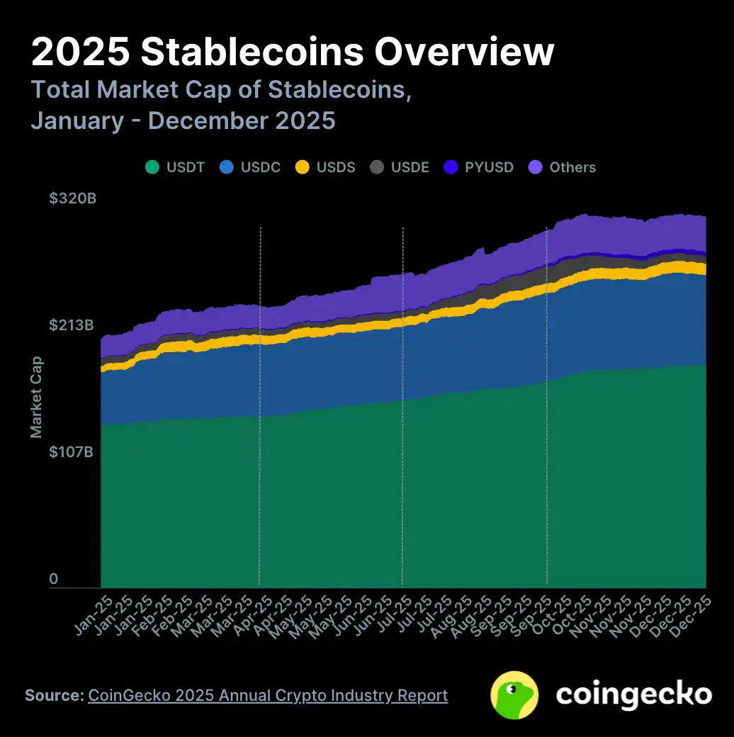 2. Stablecoin Market Cap Surged by $102.1 Billion (+48.9%) in 2025, Hitting a Record High of $311 Billion