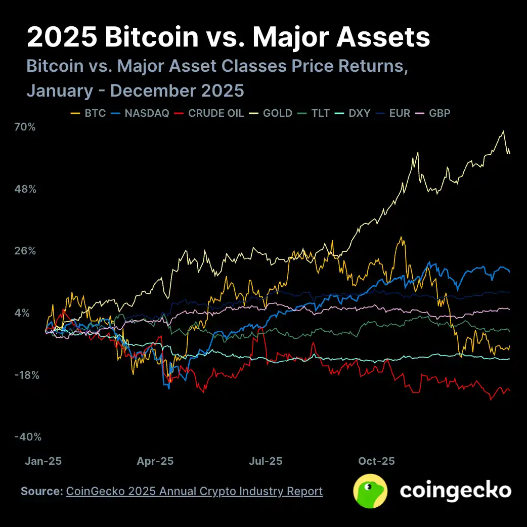 - Gold performed outstandingly in 2025, rising by 62.6%, while Bitcoin lagged, falling by 6.4%; the U.S. dollar and oil also performed poorly