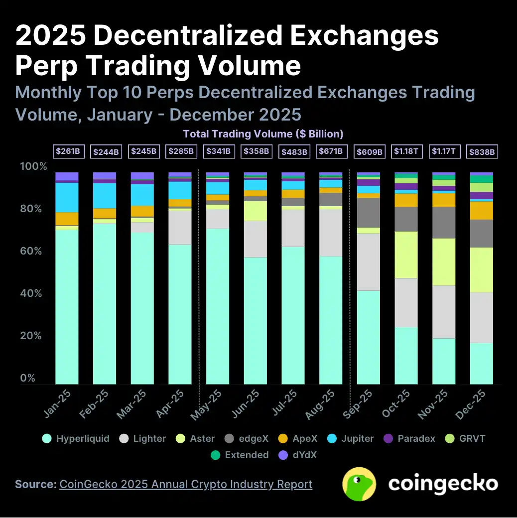 In 2025, the full-year trading volume of the top ten decentralized perpetual futures exchanges reached $6.7 trillion, a significant increase of 346% compared to $1.5 trillion in 2024. The ratio of Perp DEX to centralized perpetual futures exchange (CEX) trading volume jumped from 2.5% a year ago to 7.8%.