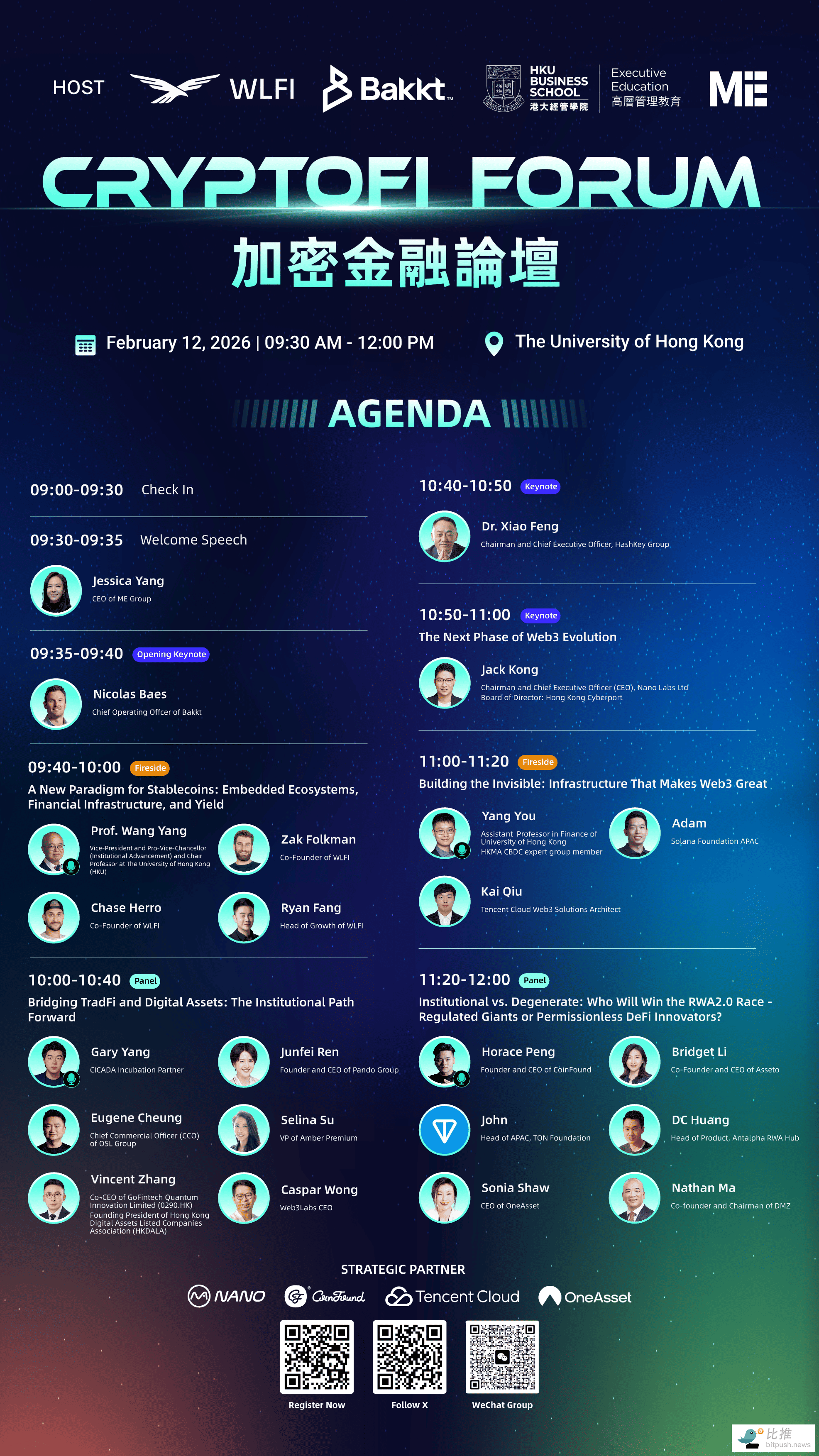 A major Crypto Finance Forum, co-hosted by WLFI, Bakkt, HKU Business School's Executive Education, and ME Group, will be held at the University of Hong Kong on February 12, 2026. Under the vision of "Decoding Crypto, Reshaping the Future of Finance," the event aims to serve as a top-tier dialogue hub connecting East and West, academia and business, and traditional finance with the crypto industry. The forum will bring together global regulators, traditional finance executives, founders of crypto-native companies, and leading academics to explore institutional opportunities and new technological paradigms within regulatory frameworks. Key topics include stablecoin ecosystems, the institutional path forward for bridging traditional finance and digital assets, and the next evolution of Web3 infrastructure. Featured speakers include executives from Bakkt, WLFI, the University of Hong Kong, Solana Foundation, Tencent Cloud, HashKey Group, and Nano Labs, among others. The agenda includes keynote speeches, in-depth panel discussions, and debates on critical issues such as regulated entities versus permissionless DeFi and the value wave of asset tokenization. This high-density intellectual gathering is designed to provide deep insights and forward-looking perspectives, helping participants navigate the complex, rapidly evolving landscape of crypto finance and capture macro opportunities in the new era of digital assets.