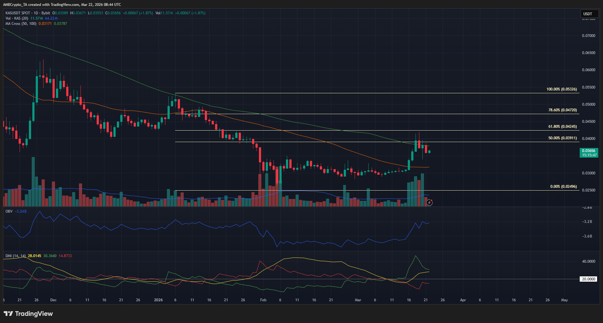 The 1-day timeframe showed that Kaspa has some bullish impetus in recent days. The trading volume soared above the 20-day average on Monday, the 16th of March, and has remained high since then.