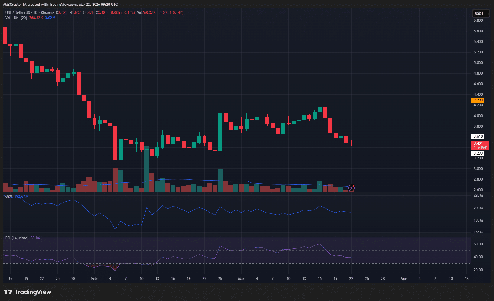 Glassnode data showed that the DeFi sector market capitalization was down 4.5% for the week. Among their leading tokens, UNI was the weakest. A week ago, it was headed toward the $4.29 local high.