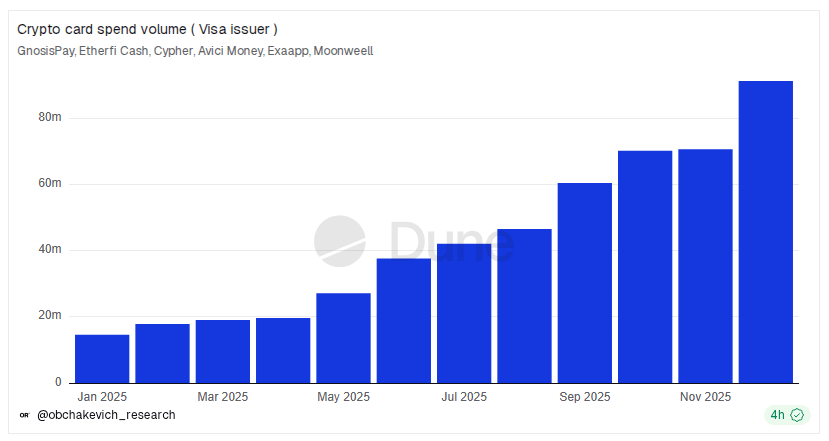 Data from Dune Analytics shows the figures measure net spend on Visa-issued crypto cards run by blockchain projects partnering with Visa. The growth appears to be steady across the year rather than a single spike, with month-by-month net spend rising through 2025.