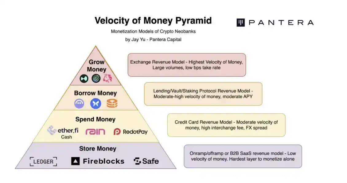 This article, from the four dimensions of "Store, Spend, Grow, Borrow," outlines the development path and competitive landscape of crypto neobanks: from self-custody wallets and stablecoin payments to on-chain trading, lending, and yield mechanisms. Author Jay Yu (Research and Investment Team Member at Pantera Capital) suggests that, using the velocity of money flow as a clue, the breakthrough for crypto neobanks might first appear in high-frequency, high-turnover growth and lending scenarios, then gradually extend to payments and storage.