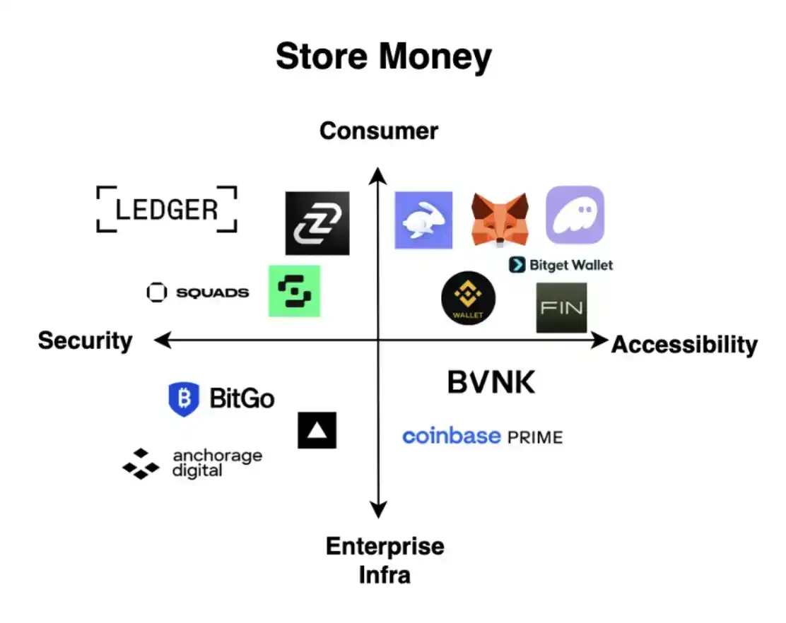 To truly achieve self-custody of crypto assets and interact with the blockchain, users must first possess some form of crypto wallet. Roughly speaking, the crypto wallet ecosystem can be divided along two dimensions: the security ↔ usability axis, and the consumer application ↔ enterprise infrastructure axis.