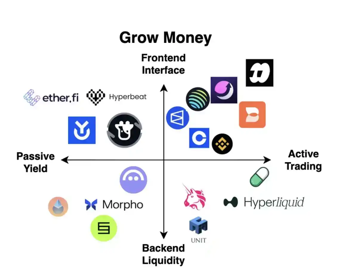 The third relationship that "crypto neobanks" establish with users is helping them grow their money. This is one of the most innovation-intensive sectors in crypto, giving birth to multiple financial primitives from 0 to 1—from staking vaults, perpetual contract trading, to token issuance platforms and prediction markets. Similar to before, we can also classify "grow money" applications along two dimensions: from passive yield to active trading, and from frontend interface to backend liquidity.