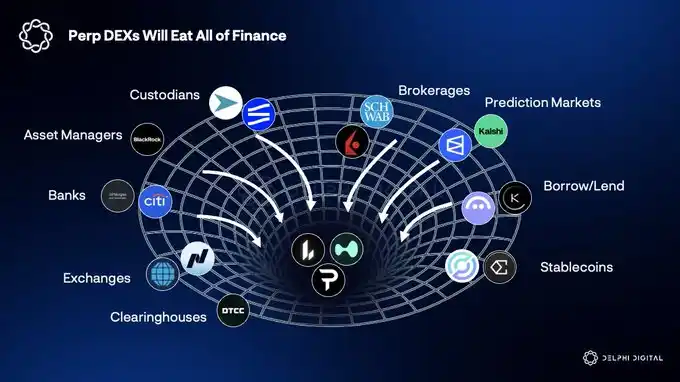 APerp DEXs are expected to consolidate fragmented traditional finance functions—such as trading, settlement, custody, and banking—into a single smart contract, effectively compressing roles like broker, exchange, custodian, and bank into one decentralized platform.