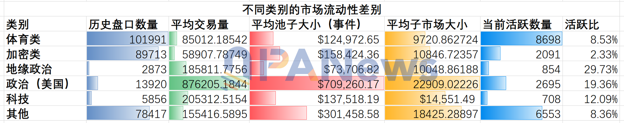 The ratio "Current Active Number / Historical Number" can indicate the growth momentum of a category. Currently, the sector with the highest growth efficiency is undoubtedly "Geopolitics". The total historical event contracts for geopolitics are only 2,873, but there are currently 854 active, an active ratio of 29.7%, the highest among all sectors.