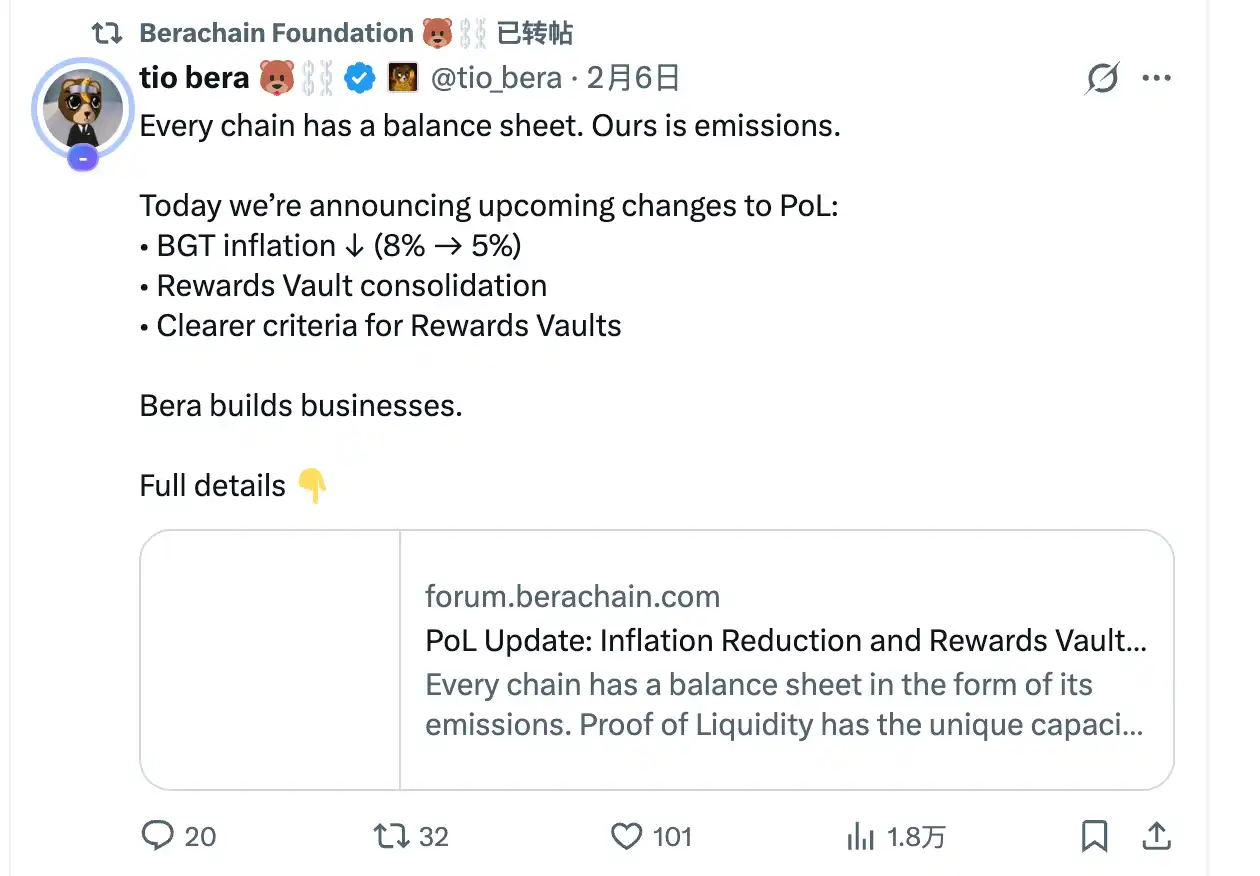 Recently, Berachain's PoL mechanism underwent a reform, reducing the annual inflation rate of $BGT from 8% to 5% (an active cut of approximately 46% in emissions), while clearing a series of "ghost vaults" and updating the vault access standards. This move has been hailed by the community as a sovereign fiscal reform.
