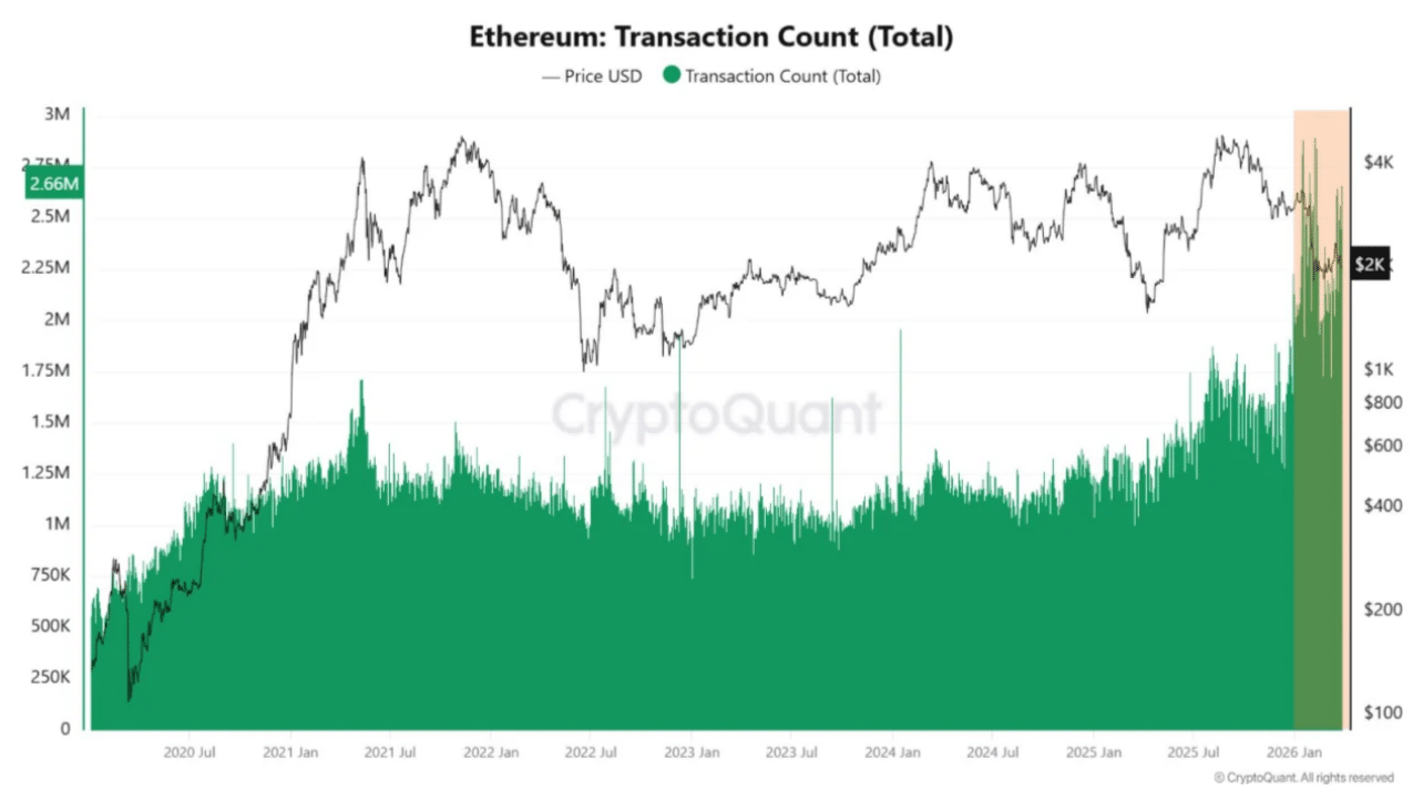 Activity rises sharply, with counts exceeding 2.6 to 2.8 million, even while price remains capped between $2,000 and $4,000.