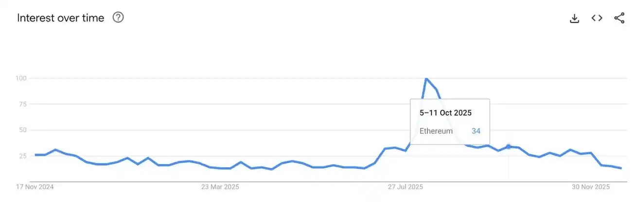From July to September this year, Google Trends data showed a significant spike in search interest for Ethereum, a trend highly consistent with the momentum of ETH corporate treasuries and ETFs. It was these traditional asset allocation channels that ignited retail investors' curiosity about Ethereum, and curiosity further translated into market attention.