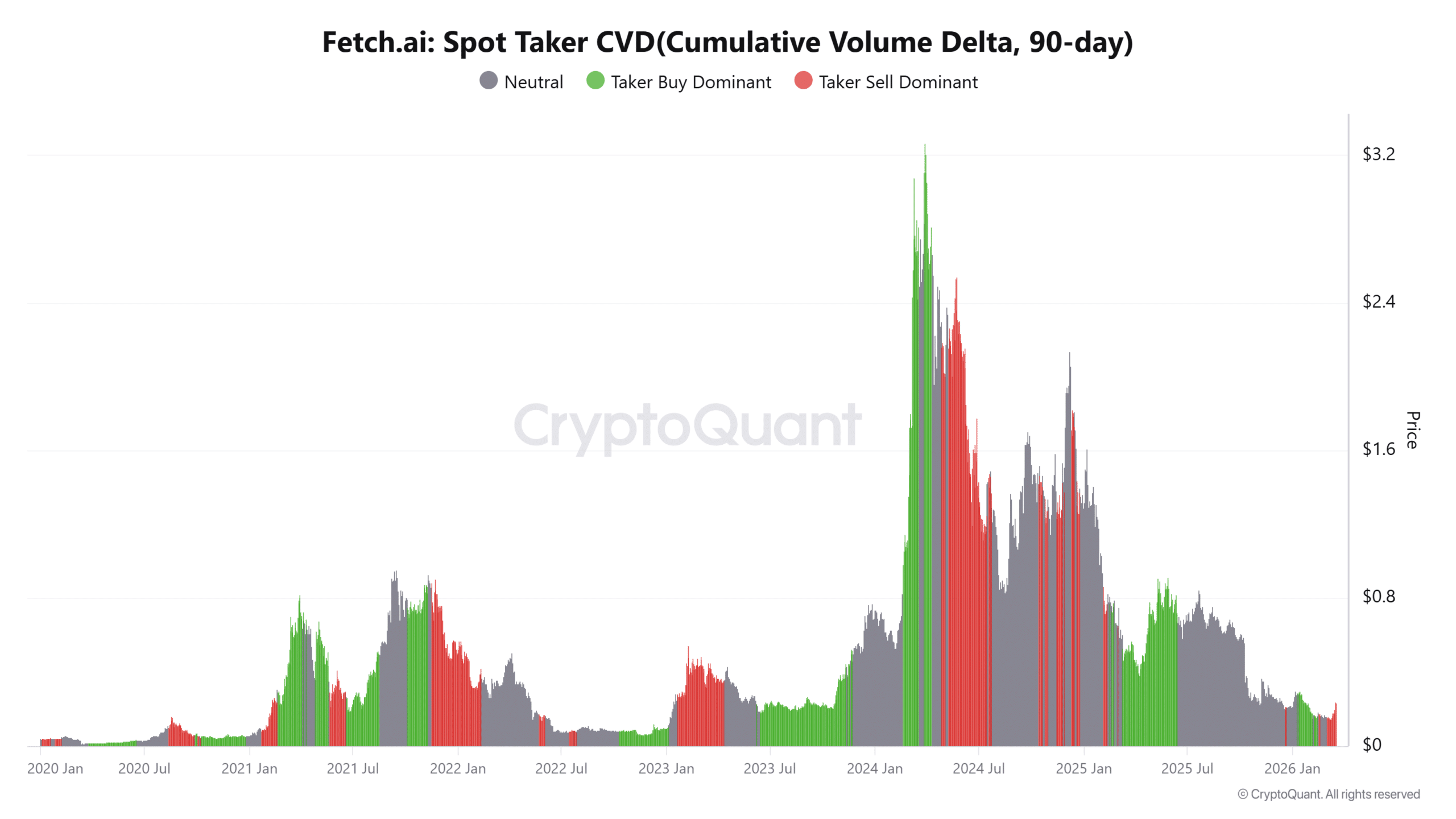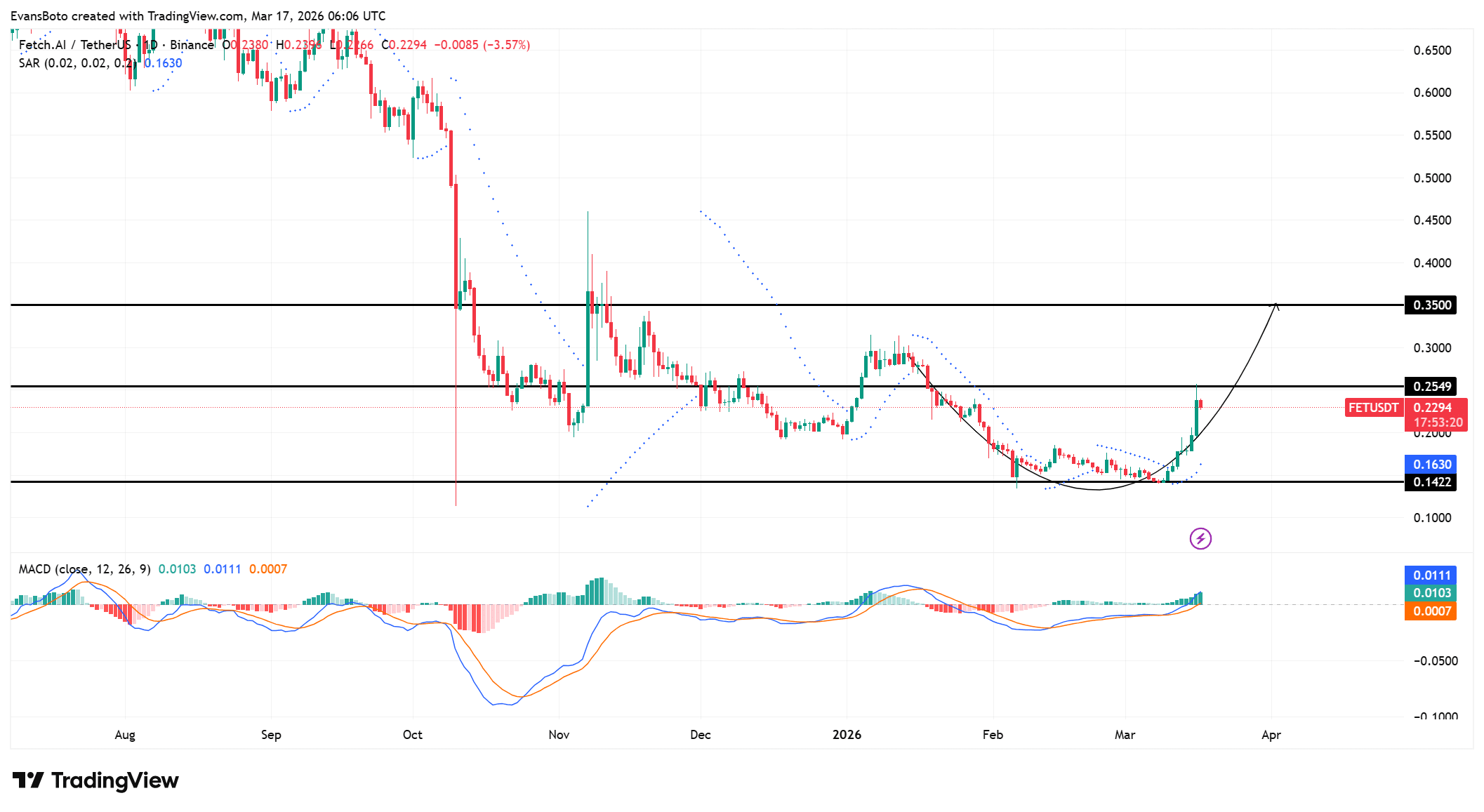 At press time, FET formed a rounded bottom after stabilizing near the $0.14 support zone, signaling a gradual shift from distribution into accumulation.