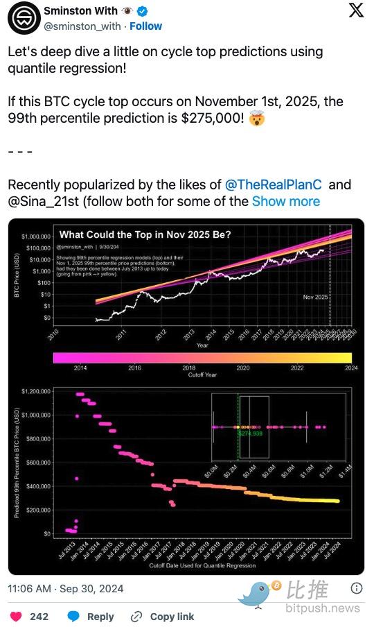 Bitcoin researcher Sminston With used quantile regression to predict the cycle top, estimating it would arrive on November 1, 2025, with Bitcoin reaching $275,000.