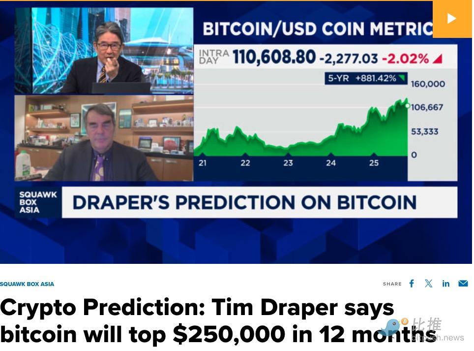 An early investor in Tesla, Skype, Baidu, and Twitch, among others. Draper previously predicted Bitcoin would reach this price in 2022, later revising the timeline to 2025.