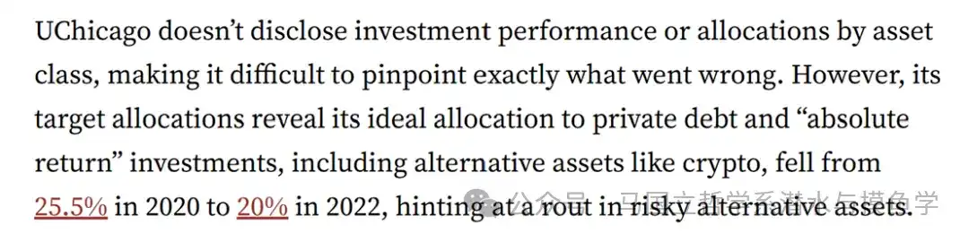 However, we do not know how much of these losses and gains came from cryptocurrency trading. The Stanford University student paper provided a less reliable clue: "[The University of Chicago's] target asset allocation shows that the ideal allocation for private debt and 'absolute return' investments (which include alternative assets such as cryptocurrency) has decreased from 25.5% in 2020 to 20% in 2022,暗示 a significant withdrawal (or downturn) in high-risk alternative assets."