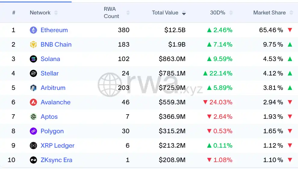 AEthereum dominates with $12.5 billion in tokenized asset TVL, capturing a 65.5% market share. Major traditional financial giants like BlackRock and JPMorgan are using it to tokenize assets such as treasury bonds and private credit. Its mature, secure infrastructure and upcoming clear regulatory frameworks are expected to allow it to capture the majority of value from this rapidly expanding trillion-dollar market.