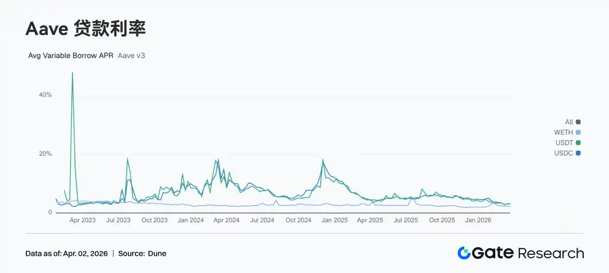 The average floating borrowing APR for USDC rose from 3.10% to 3.23%; demand for USD stablecoins did not weaken同步 with the decline in total loan balance this week. In contrast, USDT fell from 3.10% to 3.02%, and WETH also slightly decreased from 2.25% to 2.23%. While compressing broad risk exposure on-chain this week, lending demand became more concentrated on USDC. From a strategic perspective, this typically corresponds to institutions preferring USDC for liquidity scheduling, collateral management, and neutral strategy turnover. Combined with Aave's latest governance progress, the risk isolation and liquidity routing framework of V4 is gradually becoming clearer. Divergence in interest rates between different assets is likely to become more frequent in the future, better reflecting true capital preferences.