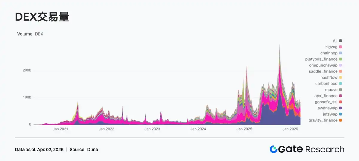 Trading heat shifted from last week's surge to a cooling phase, with top protocols generally pulling back. Weekly trading volume on both PancakeSwap and Uniswap declined compared to the previous week, indicating a overall convergence of spot trading demand on mainstream chains. The Solana side showed divergence; Meteora remained at a high level slightly above $20 billion in trading volume, but marginal growth has slowed; Raydium's weekly trading volume fell 50% sequentially, the largest drop among top DEXs. Aerodrome, Humidifi, and Bisonfi also saw varying degrees of decline. Looking at the protocol side, PancakeSwap's Infinity architecture and Meteora's DLMM remain the strongest efficiency labels, but the market this week placed more emphasis on确定性 liquidity.