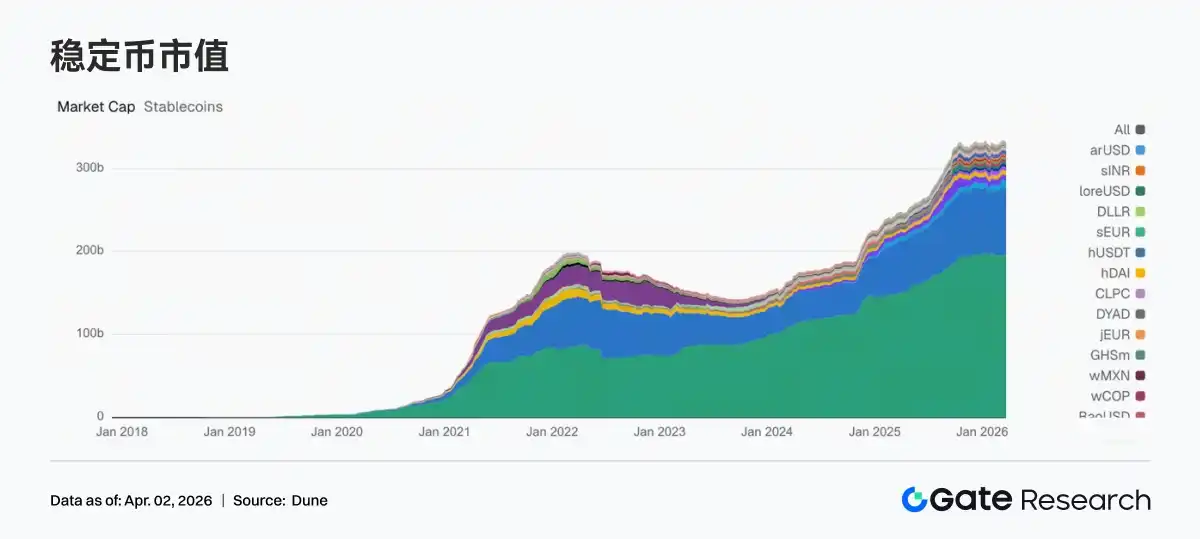 No new external inflows were seen in the stablecoin sector this week, with overall levels consolidating at highs. USDT remained almost flat compared to the previous week. USDC decreased by about $1.4 billion, and PYUSD also fell by nearly $200 million, indicating demand for payment and settlement-oriented stablecoins slightly declined this week. Protocol-type stablecoins were relatively more stable, with DAI seeing slight growth and USDS maintaining high levels. USD1, USDe, and GHO had minor fluctuations,偏向 structural reallocation. Circle continues to advance the multi-chain expansion of USDC + CCTP, but this week's data reflects a tilt within stablecoins from payment/settlement towards resilience in DeFi scenarios.