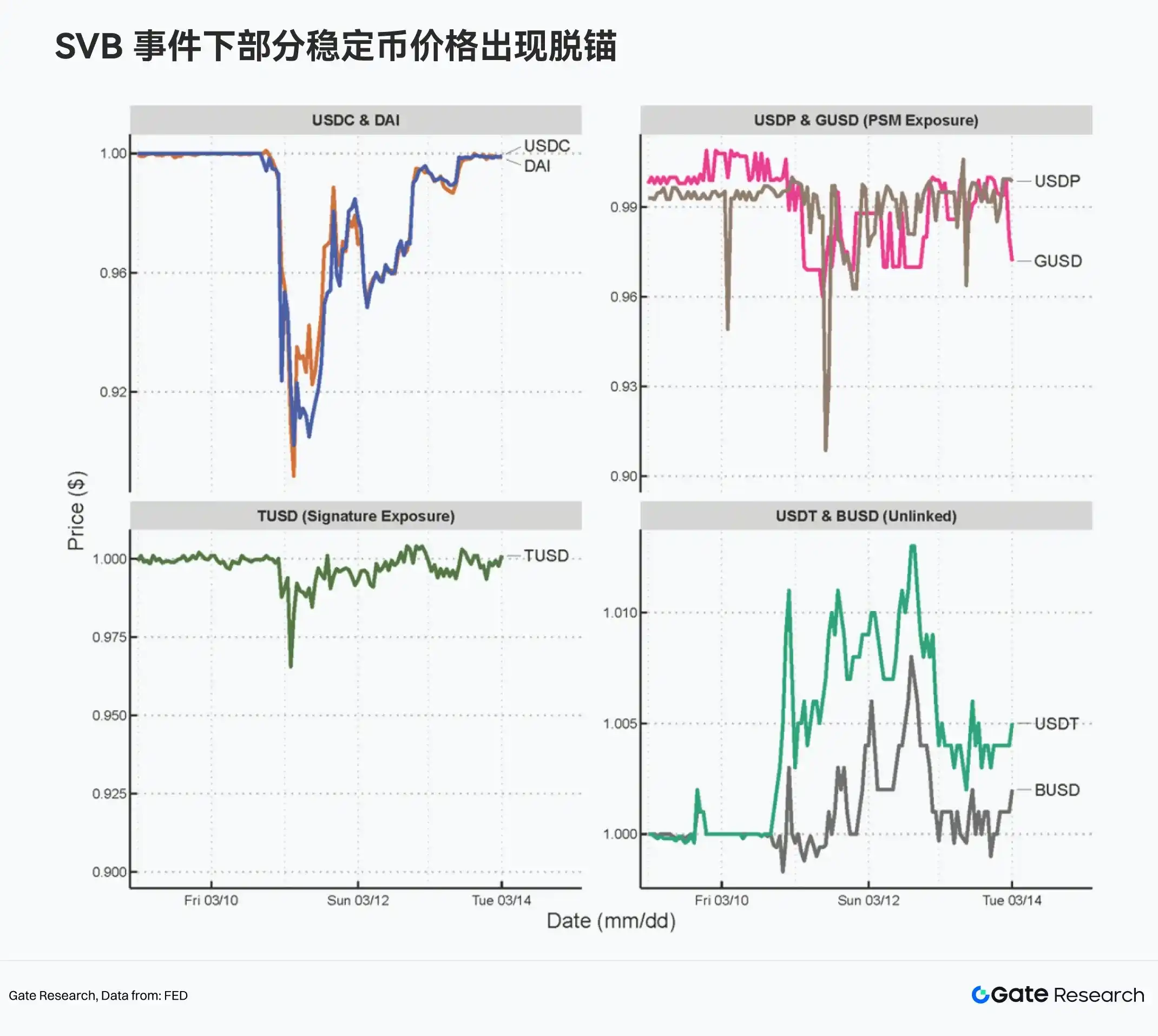 Simultaneously, this tiering did not only occur in centralized exchange markets. In the DeFi system, automated mechanisms反而 amplified risk transmission. Taking MakerDAO's "Peg Stability Module" (PSM) as an example, other stablecoins like DAI maintain a 1:1 exchange rate with USDC through the PSM. When USDC de-pegged, arbitrage行为 quickly drained the PSM's liquidity, causing stablecoins that were not directly exposed to SVB risk (e.g., DAI, USDP) to also experience price fluctuations. The technical module originally designed as a connector became an accelerator of risk under stress scenarios.
