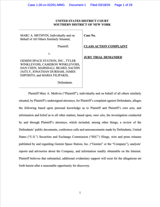 Shareholders filed a class action lawsuit in New York against crypto exchange Gemini, co-founders Tyler and Cameron Winklevoss, and multiple executives, alleging that the exchange misled investors during its 2025 initial public offering (IPO).