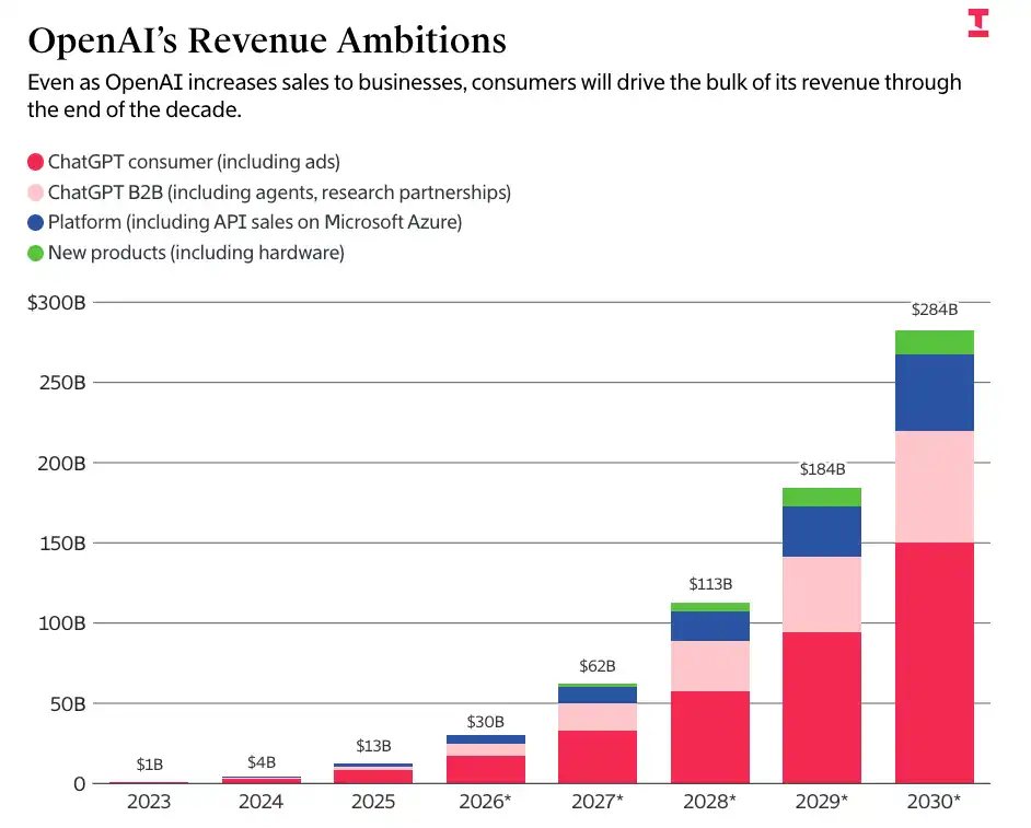换句话说,OpenAI 预测两年后的收入将超过台积电,三年后的年收入几乎与 Meta 相当,到 2030 年底的年收入将与微软相当(过去 12 个月约 3000 亿美元)。