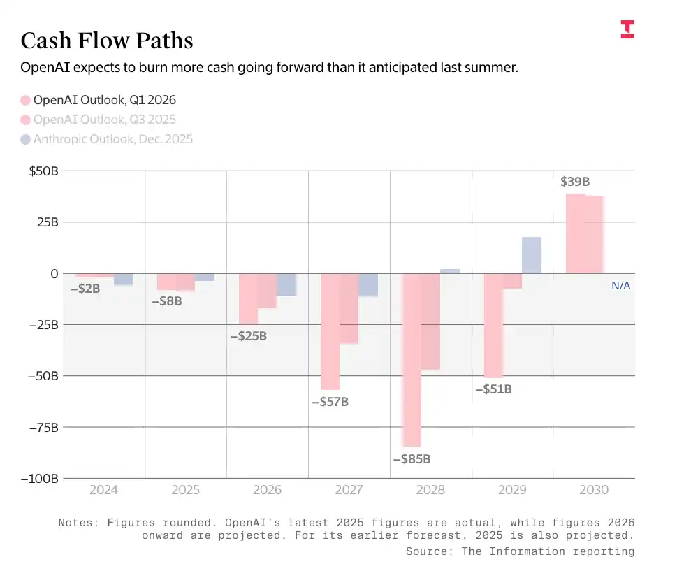 OpenAI 的数字直接来自 The Information 报道的 OpenAI 预测烧钱率和收入的泄露信息,该公司预计到 2030 年底将产生 6730 亿美元的收入,并为此烧掉 8520 亿美元: