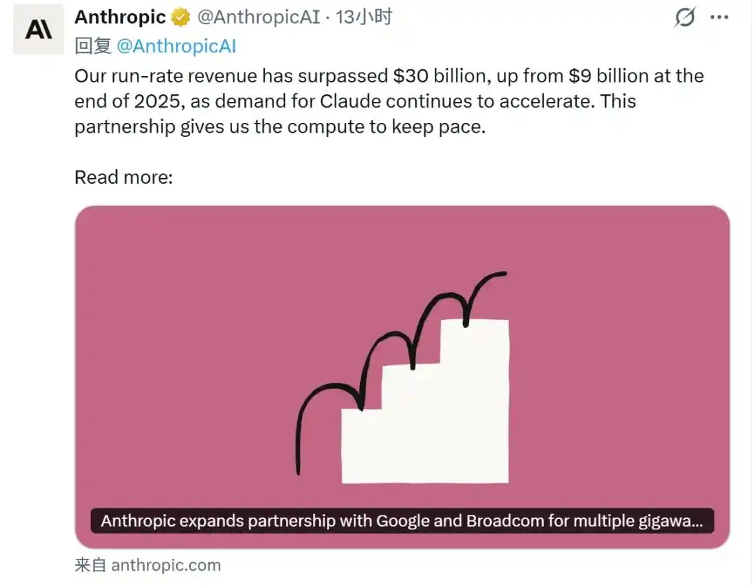 On April 7, the American large model company Anthropic announced that its annualized revenue (ARR) has reached $30 billion.