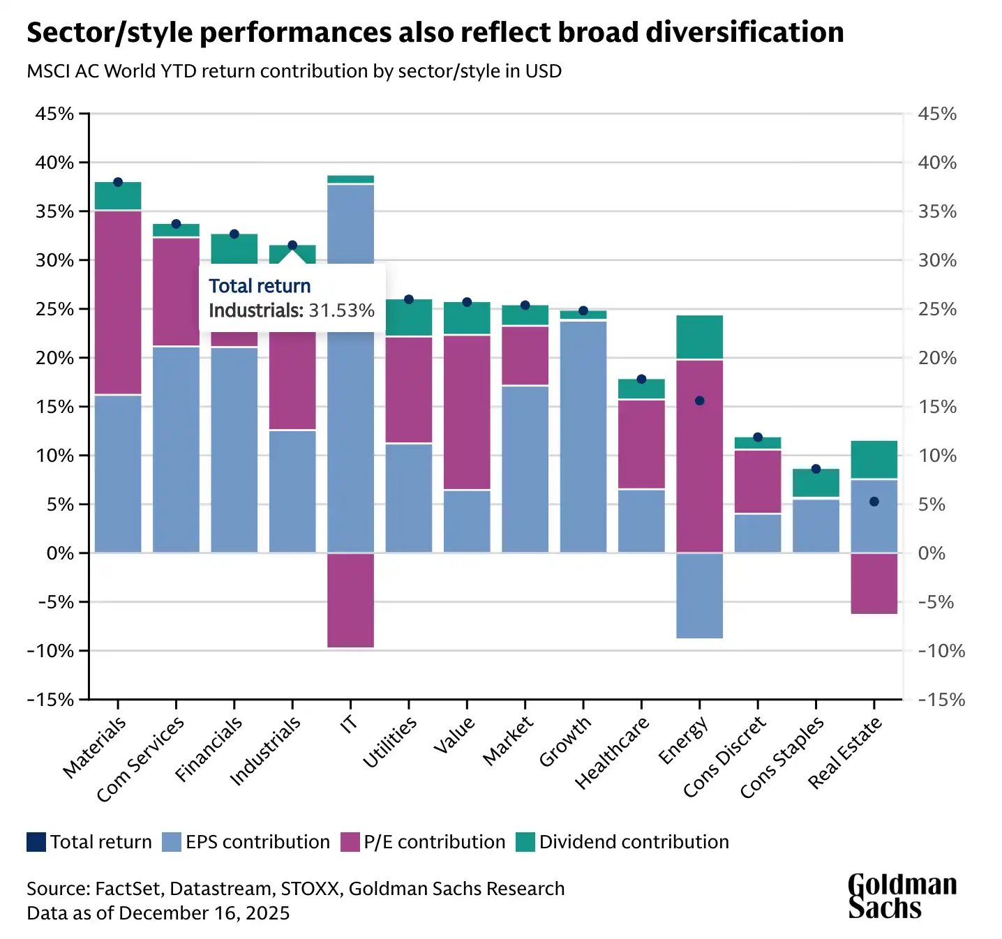 Diversification was a core theme emphasized by Goldman Sachs Research last year. In 2025, for the first time in many years, investors who diversified across regions were rewarded. Goldman Sachs analysts expect this trend to continue in 2026 and expand to include diversification across investment factors such as growth and value, as well as across various sectors. (Investment factors refer to asset characteristics such as size, value, or momentum that typically influence risk and return.)