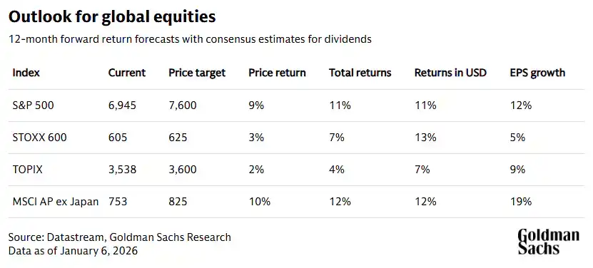 "Therefore, we believe returns in 2026 are more likely to be driven by fundamental earnings growth rather than further multiple expansion," Oppenheimer said. According to Goldman Sachs analysts' forecasts as of January 6, 2026, global share prices (weighted by regional market capitalization) are expected to rise 9% over the next 12 months, delivering an 11% return in USD terms (including dividends). He added, "The majority of the return comes from earnings."