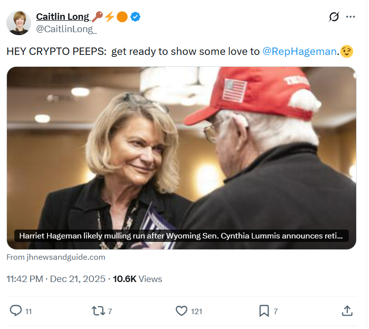Wyoming’s crypto community is already nudging her in that direction. Caitlin Long, founder of Custodia Bank and a key architect of the state’s blockchain‐friendly laws, praised Hageman as “salt of the earth.” Long was reacting to news of Hageman’s expected entry in the race.